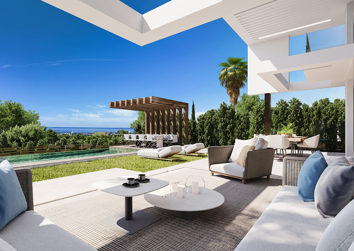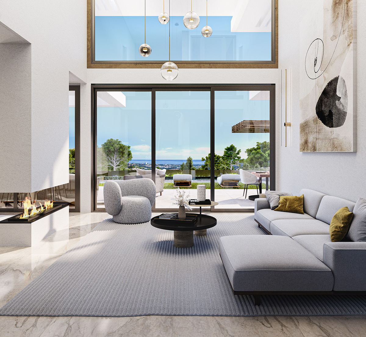 The project is designed to combine a sleek architectural language with a peaceful natural setting surrounded by pine trees and the beautiful mountain of Mijas. One of the most notable design features of the villas is the use of large windows to maximize light and space.